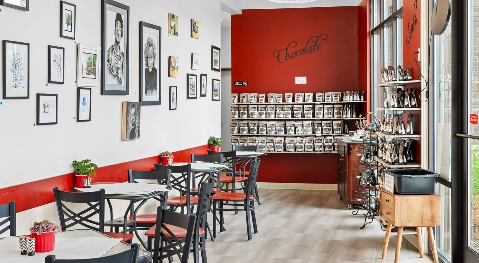 Outside of our coffee and baked goods, we also offer chocolate and candies, all made in-house. We utilize a special split kitchen that allows us to make baked goods and meals on one side, and create custom chocolate blends on the other. You may have even seen us selling these little delights at local events such as the Winter Market and Country Club nights.